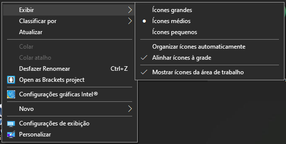 Para alterar o tamanho dos ícones, clique com o botão direito na área de trabalho e vá em "Exibir".