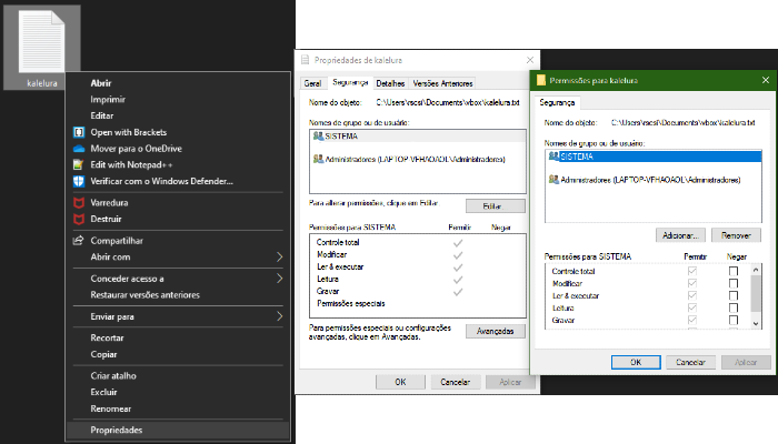 Para alterar as permissões de um arquivo ou pasta, clique com o botão direito e vá em "Propriedades". Um nova aba será aberta, clique em "Segurança > Editar".