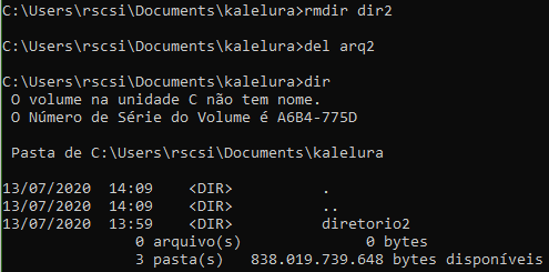 Já para excluir um arquivo, é utilizado somente o comando "del".
